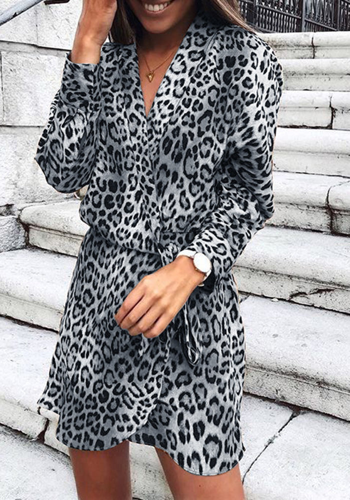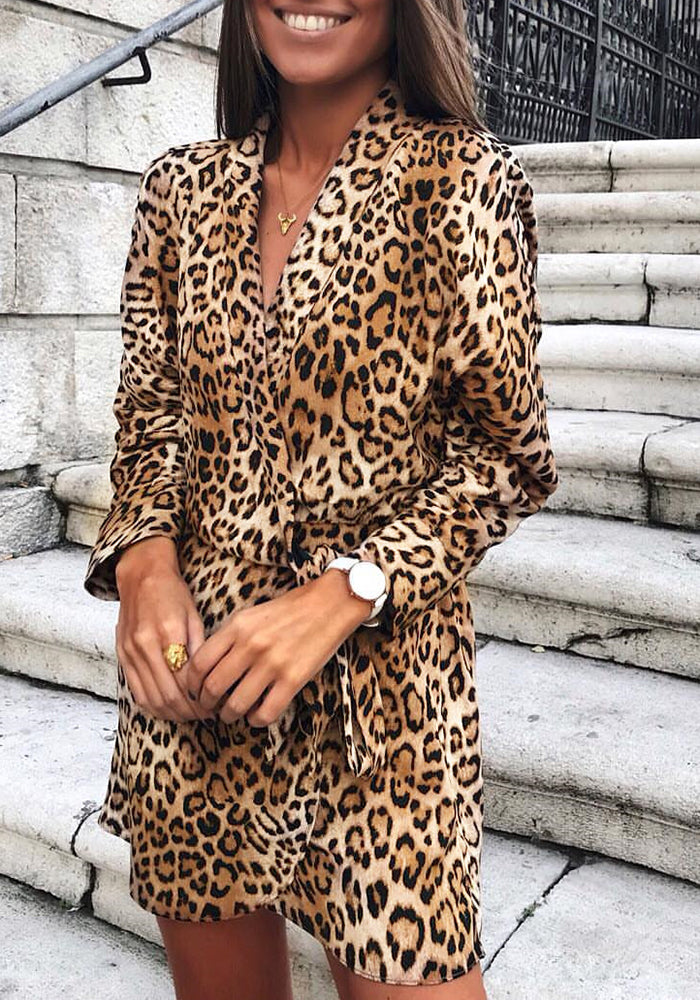 Fashion Elegant Leopard Patchwork Strap Design V Neck A Line Dresses